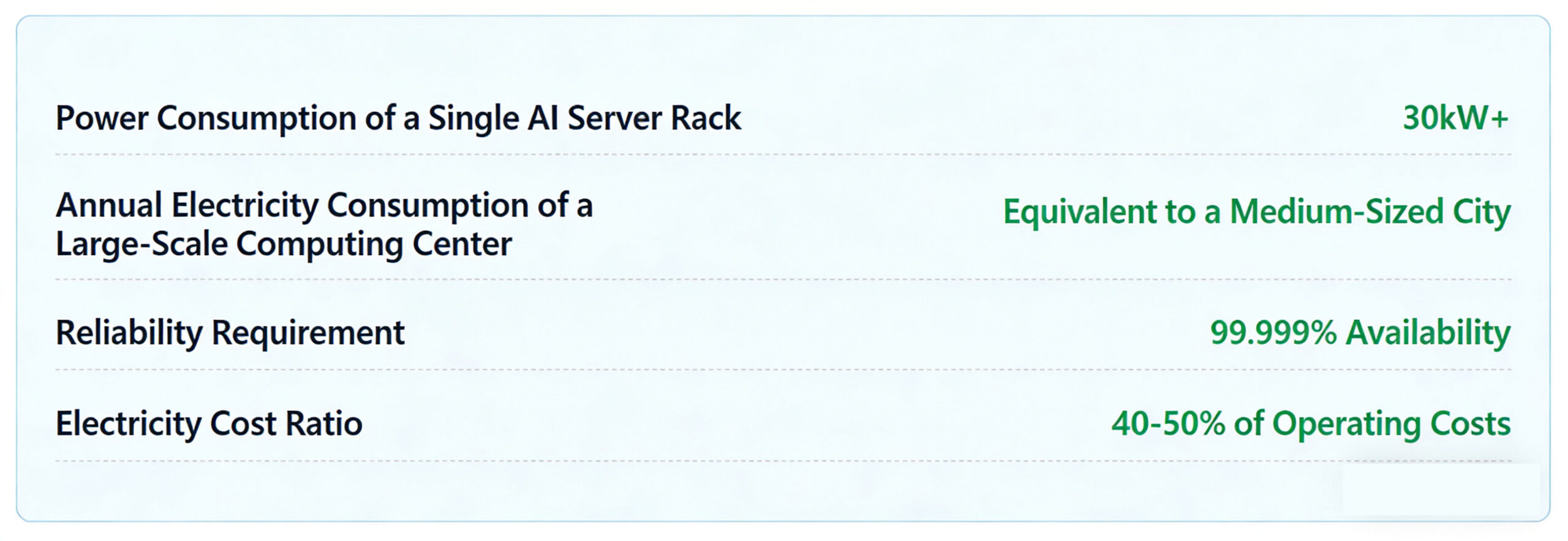 • Power consumption of a single AI data center: from tens of MW to hundreds of MW