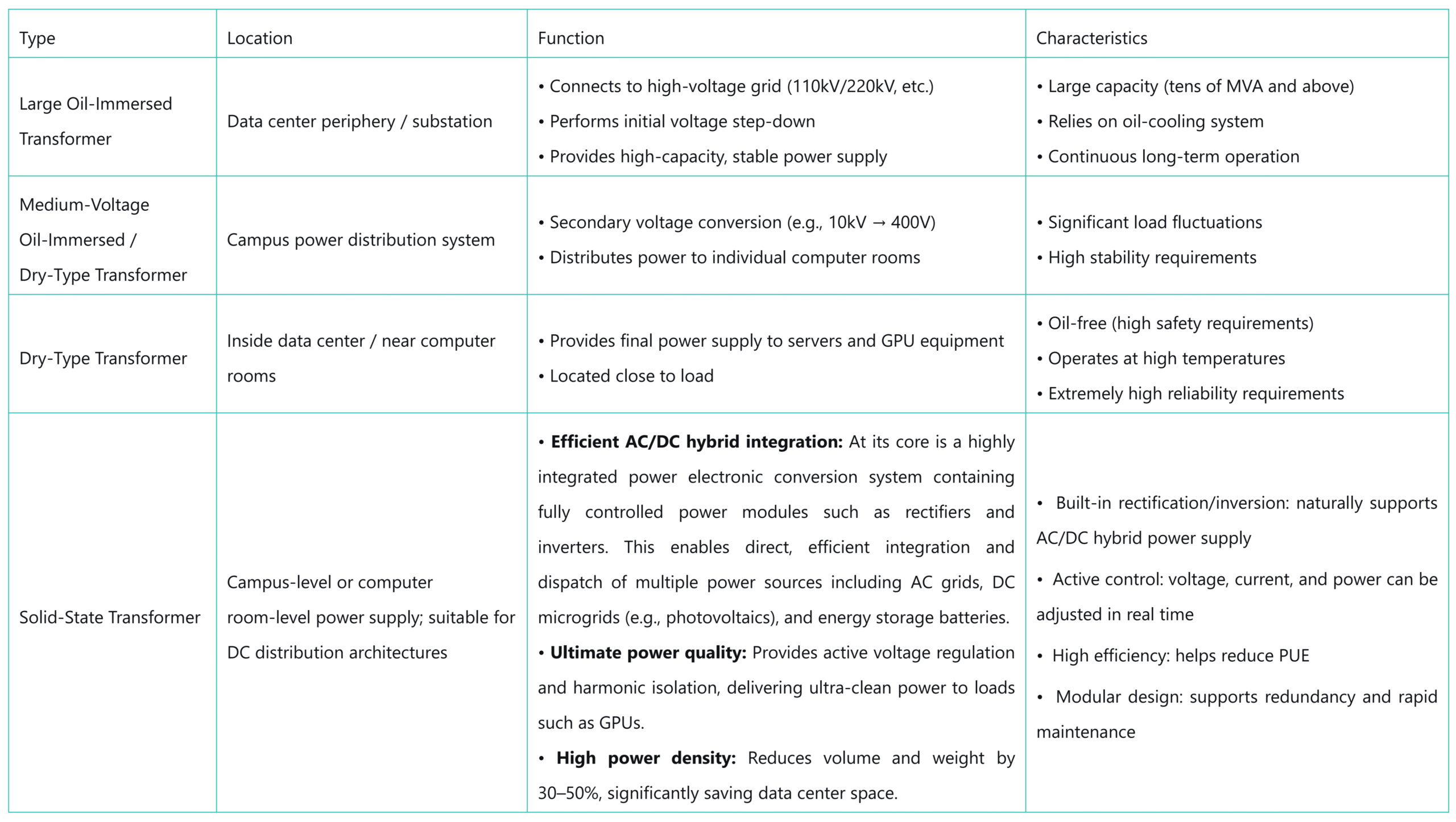 Many people assume that a data center uses only one type of transformer. However, a complete AI computing center typically includes:
